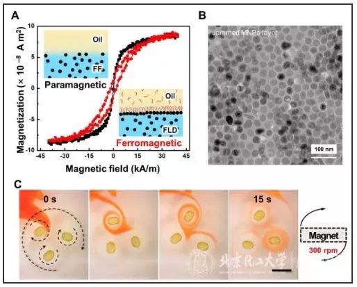 (A) 示意圖表示水相中的磁性納米粒子與油相中的配體在水油界面自組裝形成致密的二維納米薄膜及鐵磁液滴;磁滯回線表明鐵磁流體在組裝前后發生的順磁-鐵磁轉變;(B) 水油界面發生阻塞相變的磁性納米粒子的透射電子顯微鏡照片;(C)懸浮在油相中的鐵磁液滴在外部磁場作用下旋轉,紅色染料記錄了液滴周圍液體的湍流軌跡。